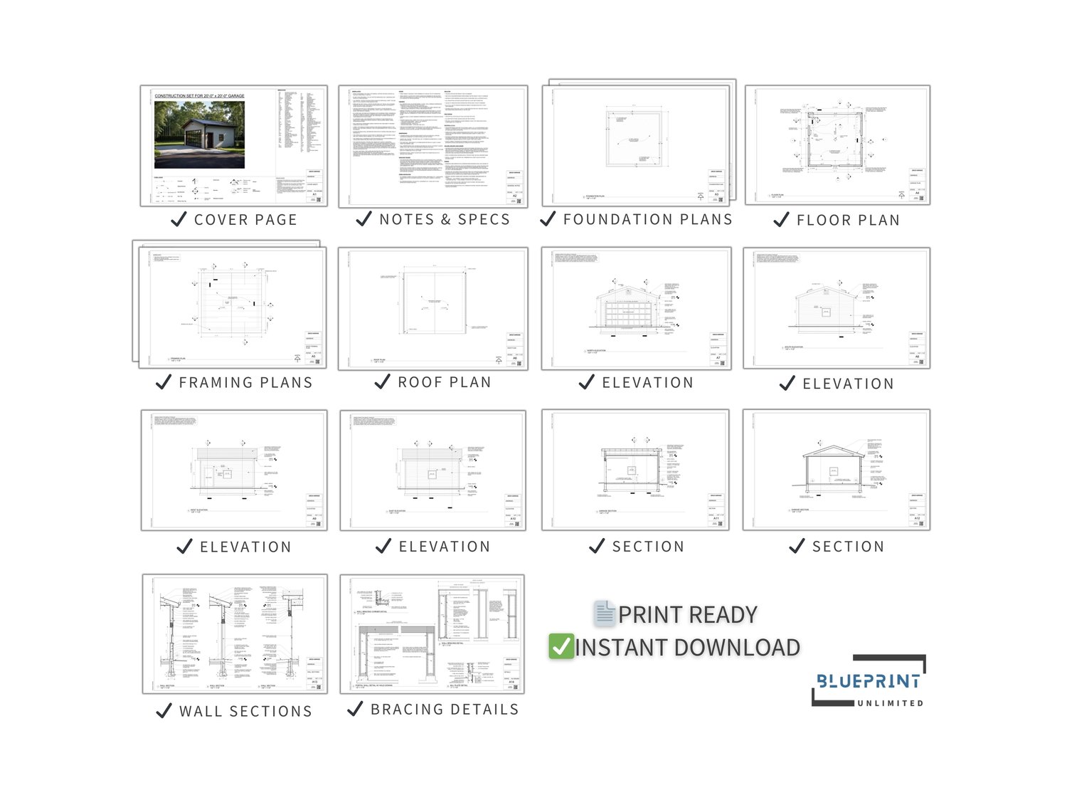The garage drawings come with complete sections and bracing details, ensuring that you have everything you need to bring your project to life. Measuring at a convenient 11x17 (Tabloid) size, the sheets are easy to print and handle. Each blueprint set is meticulously drafted, taking into account the safety and structural integrity of the garage.