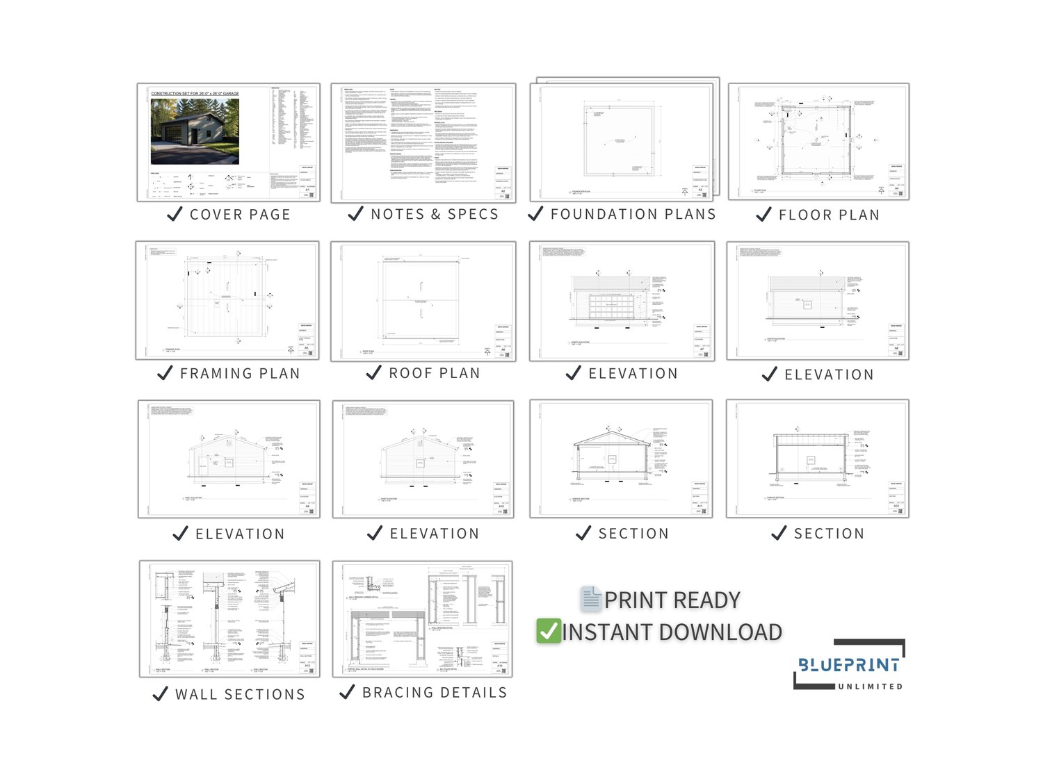 The garage drawings come with complete sections and bracing details, ensuring that you have everything you need to bring your project to life. Measuring at a convenient 11x17 (Tabloid) size, the sheets are easy to print and handle. Each blueprint set is meticulously drafted, taking into account the safety and structural integrity of the garage.
